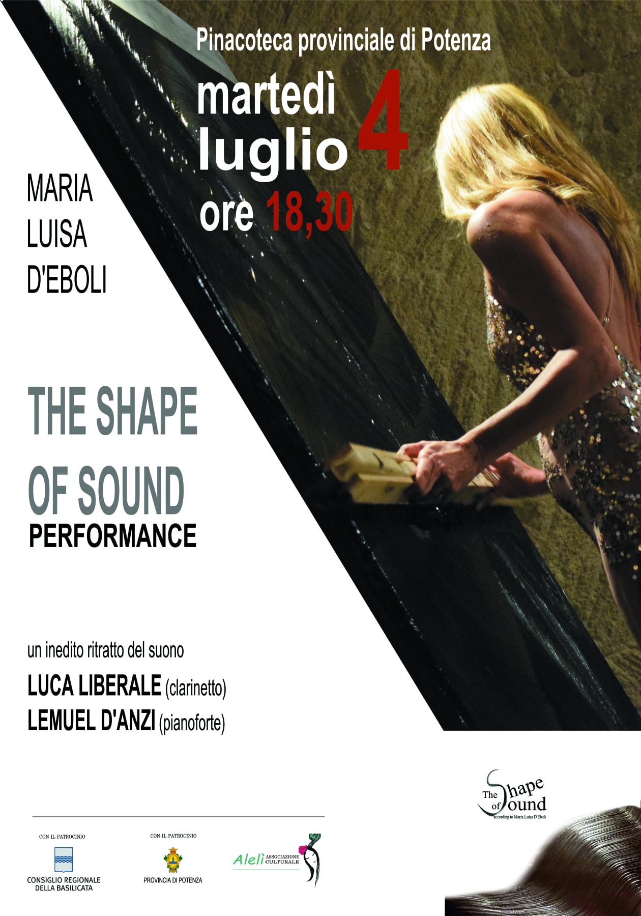 Evento di finissage della personale "Madre Arte", esposta nella Pinacoteca privinciale di Potenza, dell'artista di origini lucane Maria Luisa D'Eboli, che si esibirà in una pérformance live che avrà come protagonista il suono, nel caso specifico, del clarinetto di Luca Liberale e del pianoforte elettronico di Lemuel D'Anzi. Il suono poserà come "modello" dell'Artista, la quale, seguendo le note e le vibrazioni emotive, elaborerà il suo progetto pittorico fino alla realizzazione.